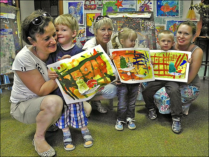 Рисовать с мамой для ребенка — удовольствие. Совсем маленькие детки могут сидеть при этом на коленях у мамы и создавать общею композицию. По этой методике мы можем начинать рисовать с года. И даже рисовать пальцами без кисточки. Важно, однако, не застревать надолго в «пальчиковом рисовании» и как можно скорее перейти на кисточку. В таких занятиях важен не результат, а процесс. ТИемы для занятий предлагаются природные и настроенческие.